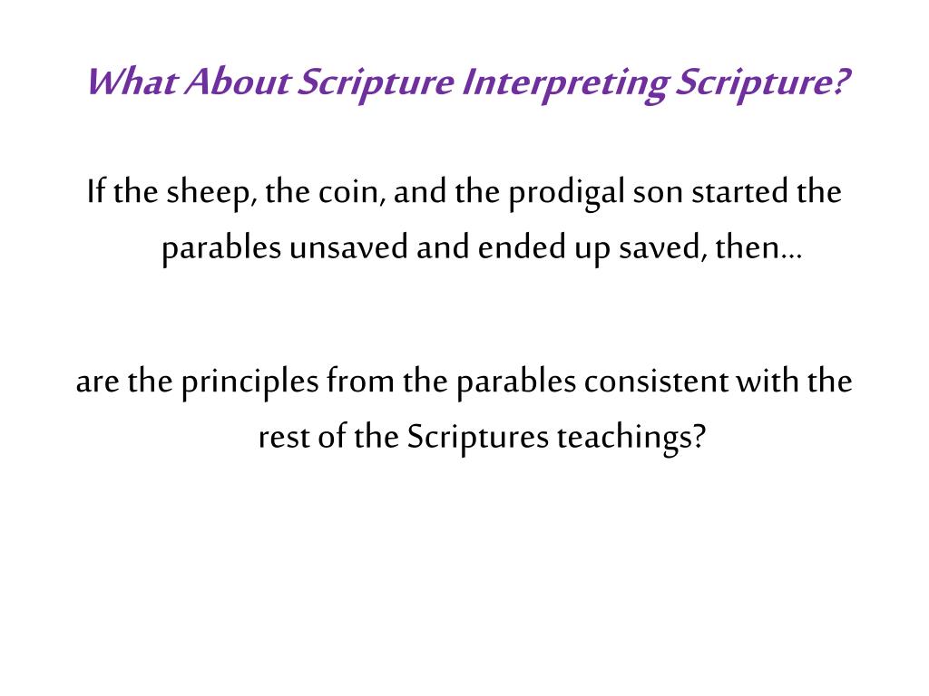 What About Scripture Interpreting Scripture? If the sheep, the coin, and the prodigal son started the parables unsaved and ended up saved, then… are the principles from the parables consistent with the rest of the Scriptures teachings?