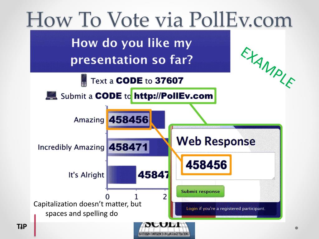 How To Vote via PollEv.com EXAMPLE Capitalization doesn’t matter, but spaces and spelling do TIP