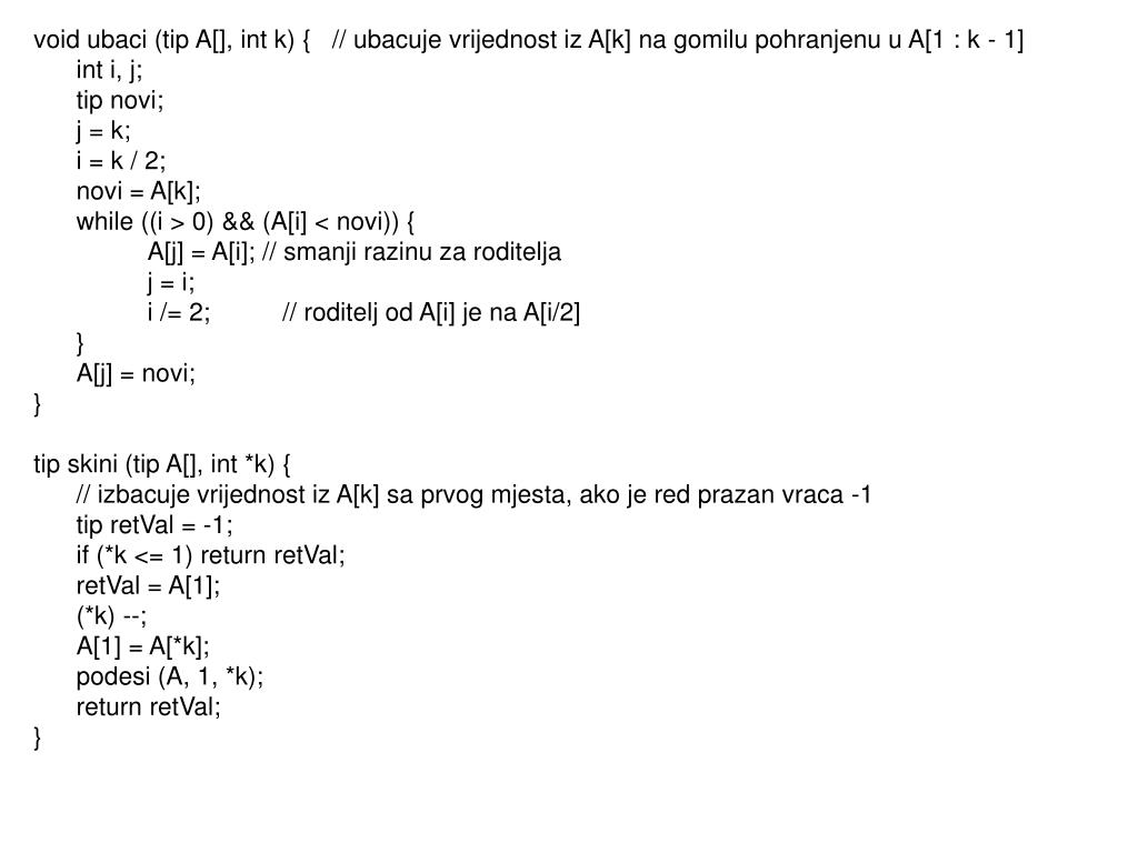 void ubaci (tip A[], int k) { // ubacuje vrijednost iz A[k] na gomilu pohranjenu u A[1 : k - 1] int i, j; tip novi; j = k; i = k / 2; novi = A[k]; while ((i > 0) && (A[i] < novi)) { A[j] = A[i]; // smanji razinu za roditelja j = i; i /= 2; // roditelj od A[i] je na A[i/2] } A[j] = novi; } tip skini (tip A[], int *k) { // izbacuje vrijednost iz A[k] sa prvog mjesta, ako je red prazan vraca -1 tip retVal = -1; if (*k <= 1) return retVal; retVal = A[1]; (*k) --; A[1] = A[*k]; podesi (A, 1, *k); return retVal; }