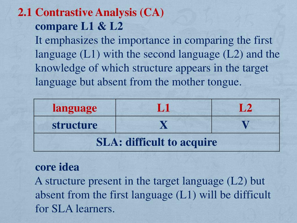 2.1 Contrastive Analysis (CA) compare L1 & L2 It emphasizes the importance in comparing the first language (L1) with the second language (L2) and the knowledge of which structure appears in the target language but absent from the mother tongue. core idea A structure present in the target language (L2) but absent from the first language (L1) will be difficult for SLA learners.