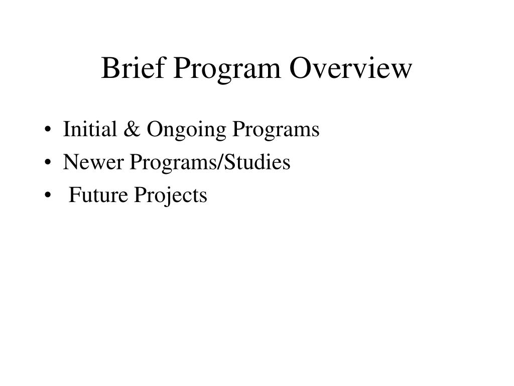 Brief Program Overview Initial & Ongoing Programs Newer Programs/Studies Future Projects