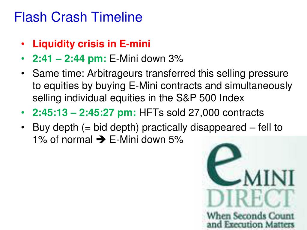 Flash Crash Timeline Liquidity crisis in E-mini 2:41 – 2:44 pm: E-Mini down 3% Same time: Arbitrageurs transferred this selling pressure to equities by buying E-Mini contracts and simultaneously selling individual equities in the S&P 500 Index 2:45:13 – 2:45:27 pm: HFTs sold 27,000 contracts Buy depth (=bid depth) practically disappeared – fell to 1% of normal E-Mini down 5%
