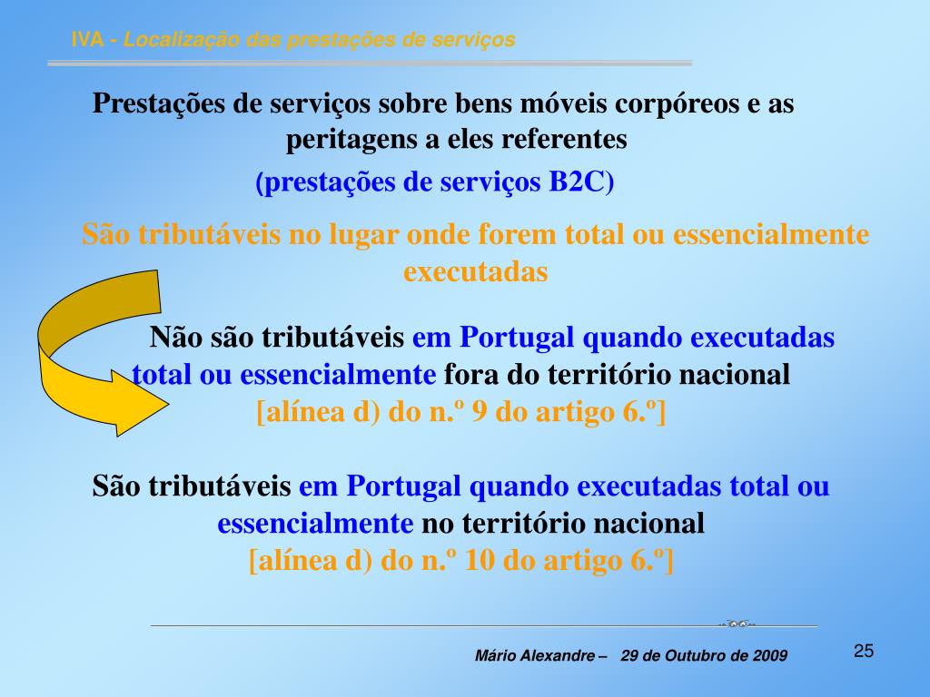 IVA - Localização das prestações de serviços Prestações de serviços sobre bens móveis corpóreos e as peritagens a eles referentes (prestações de serviços B2C) São tributáveis no lugar onde forem total ou essencialmente executadas Não são tributáveis em Portugal quando executadas total ou essencialmente fora do território nacional [alínea d) do n.º 9 do artigo 6.º] São tributáveis em Portugal quando executadas total ou essencialmente no território nacional [alínea d) do n.º 10 do artigo 6.º] Mário Alexandre – 29 de Outubro de 2009