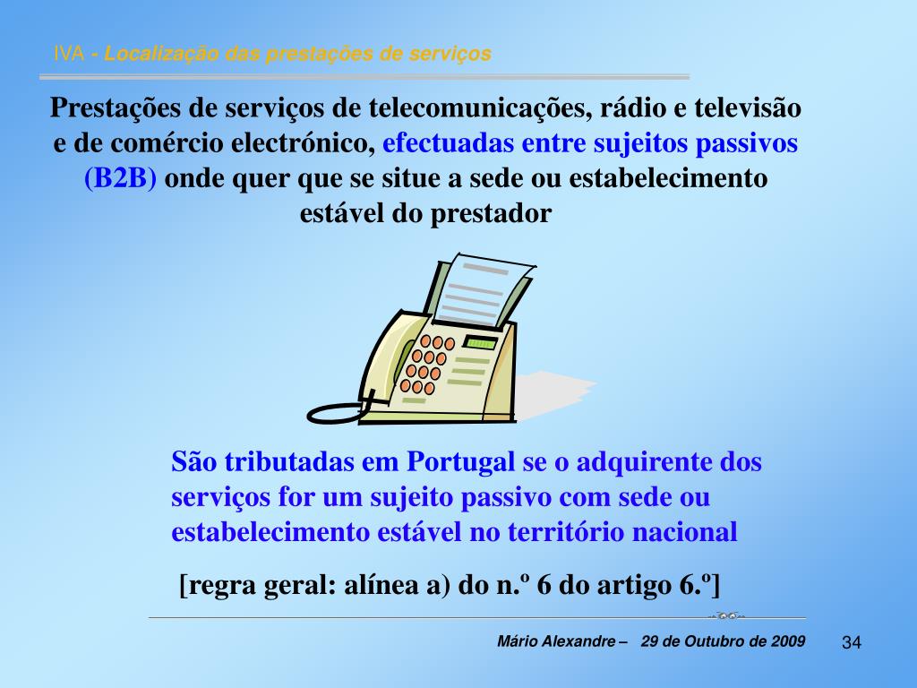 IVA- Localização das prestações de serviços Prestações de serviços de telecomunicações, rádio e televisão e de comércio electrónico, efectuadas entre sujeitos passivos (B2B) onde quer que se situe a sede ou estabelecimento estável do prestador São tributadas em Portugal se o adquirente dos serviços for um sujeito passivo com sede ou estabelecimento estável no território nacional [regra geral: alínea a) do n.º 6 do artigo 6.º] Mário Alexandre – 29 de Outubro de 2009