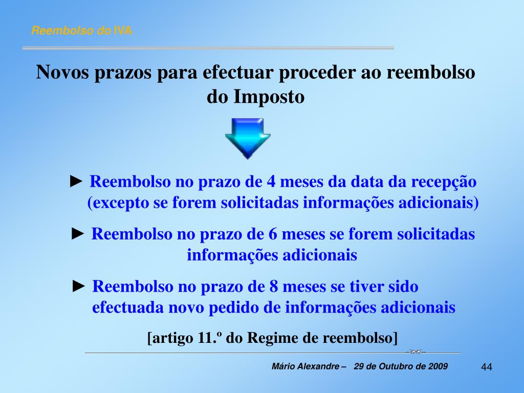 Reembolso do IVA Novos prazos para efectuar proceder ao reembolso do Imposto ► Reembolso no prazo de 4 meses da data da recepção (excepto se forem solicitadas informações adicionais) ► Reembolso no prazo de 6 meses se forem solicitadas informações adicionais ► Reembolso no prazo de 8 meses se tiver sido efectuada novo pedido de informações adicionais [artigo 11.º do Regime de reembolso] Mário Alexandre – 29 de Outubro de 2009