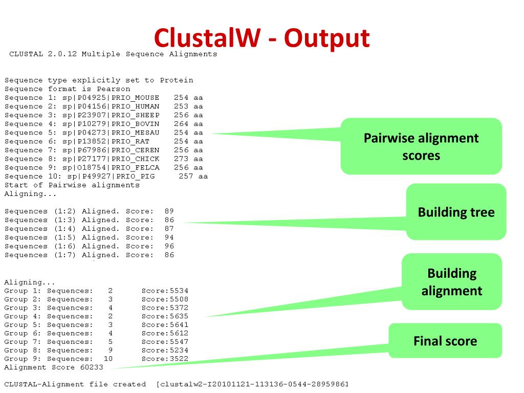 ClustalW - Output Pairwise alignment scores Building tree Building alignment Final score