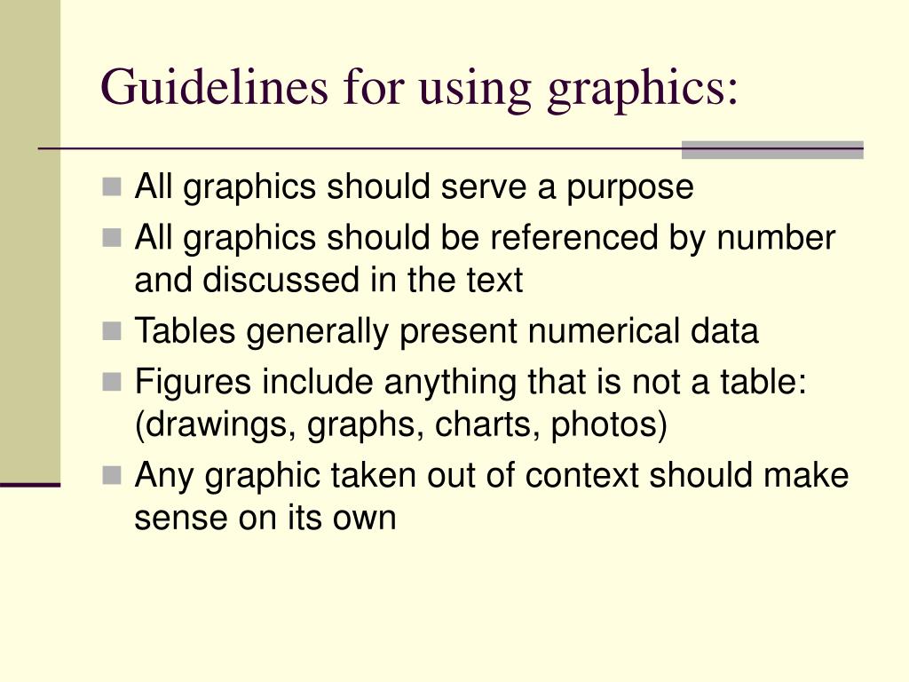 Guidelines for using graphics: • All graphics should serve a purpose • All graphics should be referenced by number and discussed in the text • Tables generally present numerical data • Figures include anything that is not a table: (drawings, graphs, charts, photos) • Any graphic taken out of context should make sense on its own