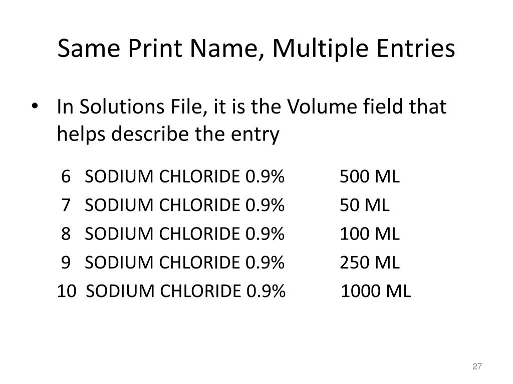 Same Print Name, Multiple Entries • In Solutions File, it is the Volume field that helps describe the entry 6 SODIUM CHLORIDE 0.9% 500 ML 7 SODIUM CHLORIDE 0.9% 50 ML 8 SODIUM CHLORIDE 0.9% 100 ML 9 SODIUM CHLORIDE 0.9% 250 ML 10 SODIUM CHLORIDE 0.9% 1000 ML