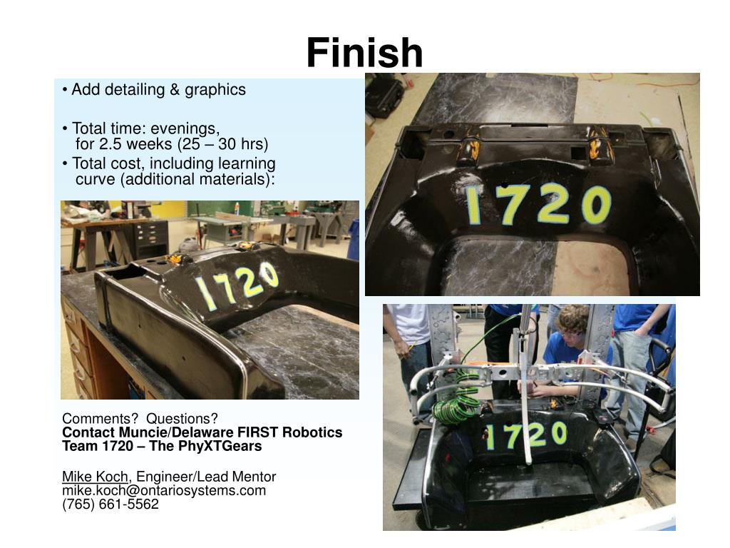 Finish Add detailing & graphics Total time: evenings, for 2.5 weeks (25 – 30 hrs) Total cost, including learning curve (additional materials): Comments? Questions? Contact Muncie/Delaware FIRST Robotics Team 1720 – The PhyXTGears Mike Koch, Engineer/Lead Mentormike.koch@ontariosystems.com (765) 661-5562