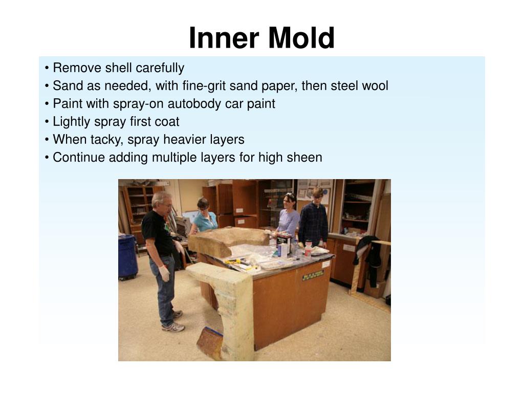 Inner Mold Remove shell carefully Sand as needed, with fine-grit sand paper, then steel wool Paint with spray-on autobody car paint Lightly spray first coat When tacky, spray heavier layers Continue adding multiple layers for high sheen