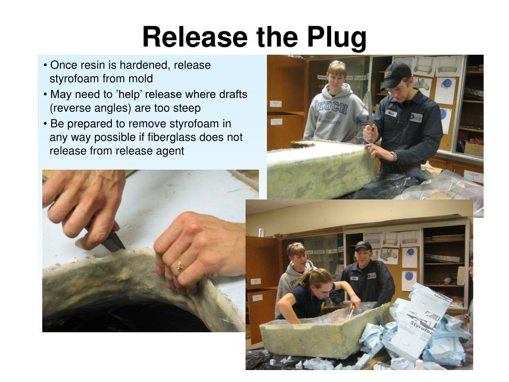 Release the Plug Once resin is hardened, release styrofoam from mold May need to ’help’ release where drafts (reverse angles) are too steep Be prepared to remove styrofoam in any way possible if fiberglass does not release from release agent