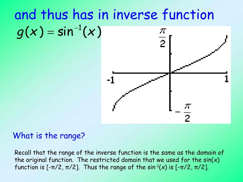 and thus has in inverse function What is the domain? Recall that the domain of the inverse function is the same as the range of the original function. The range of the sin(x) function is [-1, 1]. Thus the domain of the sin-1(x) is [-1, 1]. continued on next slide