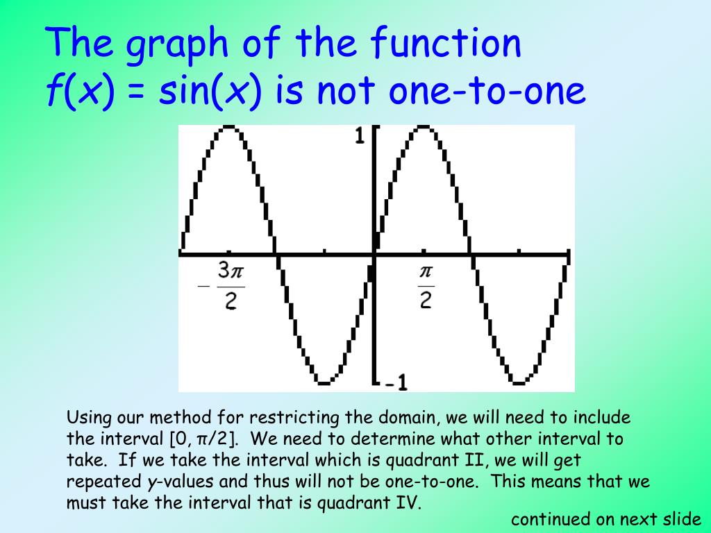 The graph of the function f(x) = sin(x) is not one-to-one Using our method for restricting the domain, we will need to include the interval [0, π/2]. We need to determine what other interval to take. If we take the interval which is quadrant II, we will get repeated y-values and thus will not be one-to-one. This means that we must take the interval that is quadrant IV. continued on next slide