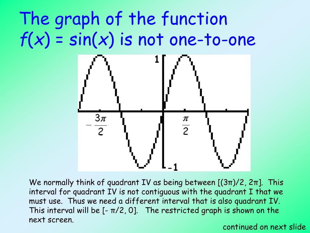 The graph of the function f(x) = sin(x) is not one-to-one We normally think of quadrant IV as being between [(3π)/2, 2π]. This interval for quadrant IV is not contiguous with the quadrant I that we must use. Thus we need a different interval that is also quadrant IV. This interval will be [- π/2, 0]. The restricted graph is shown on the next screen. continued on next slide