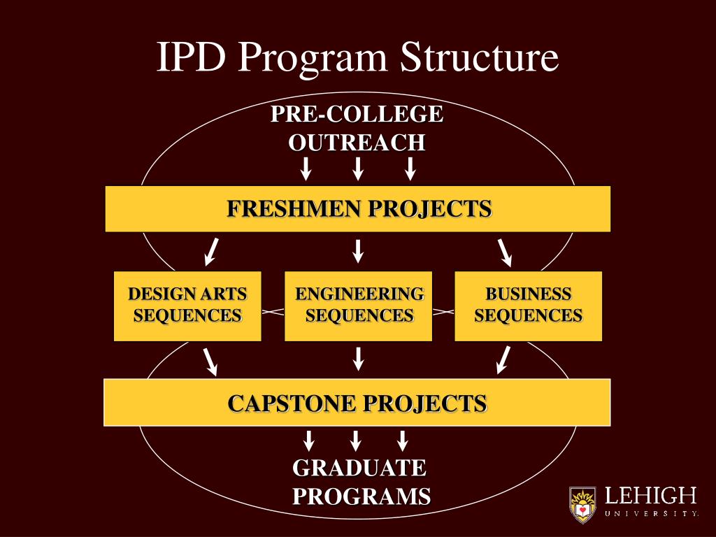 >150 Industry Sponsors >1000 students in over 175 project teams 2003 Capstone 34 teams, 203 students, 20 Majors 18 faculty advisors Projects from a) companies, b) local entrepreneurs, c) student entrepreneurs Contacts made through Lehigh’s Career Services, Corporate Relations, Alumni, SBDC & Ben Franklin Center 7 CONSECTUTIVE YEARS of NATIONAL WINNERS for student technology entrepreneurship: NCIIA grants $8K-$20K IPD Capstone Project Statistics