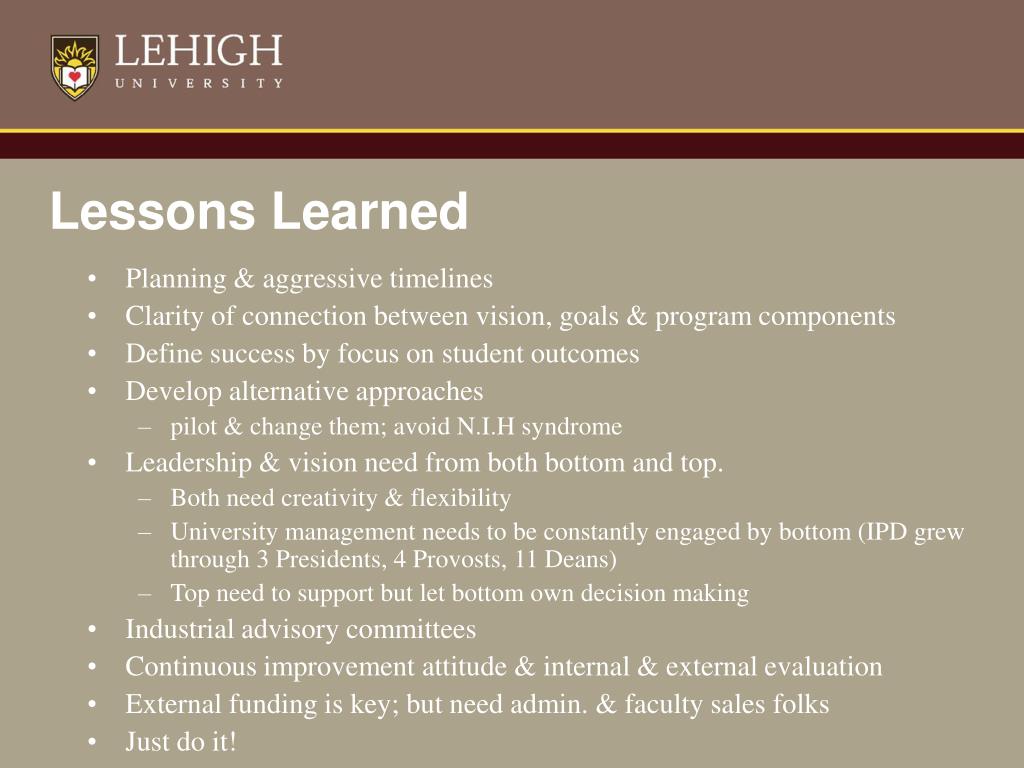 Planning & aggressive timelines Clarity of connection between vision, goals & program components Define success by focus on student outcomes Develop alternative approaches pilot & change them; avoid N.I.H syndrome Leadership & vision need from both bottom and top. Both need creativity & flexibility University management needs to be constantly engaged by bottom (IPD grew through 3 Presidents, 4 Provosts, 11 Deans) Top need to support but let bottom own decision making Industrial advisory committees Continuous improvement attitude & internal & external evaluation External funding is key; but need admin. & faculty sales folks Just do it! Lessons Learned