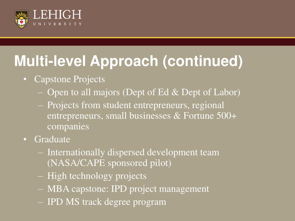 Capstone Projects Open to all majors (Dept of Ed & Dept of Labor) Projects from student entrepreneurs, regional entrepreneurs, small businesses & Fortune 500+ companies Graduate Internationally dispersed development team (NASA/CAPE sponsored pilot) High technology projects MBA capstone: IPD project management IPD MS track degree program Multi-level Approach (continued)