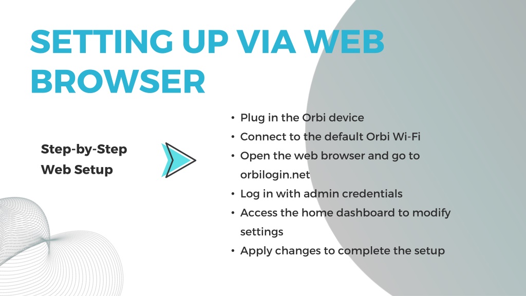 SETTING UP VIA WEB BROWSER • Plug in the Orbi device • Connect to the default Orbi Wi-Fi • Open the web browser and go to orbilogin.net • Log in with admin credentials • Access the home dashboard to modify settings • Apply changes to complete the setup Step-by-Step Web Setup