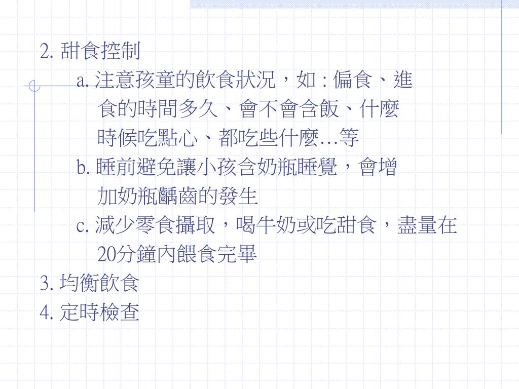 2.甜食控制 a. 注意孩童的飲食狀況,如 : 偏食、進 食的時間多久、會不會含飯、什麼 時候吃點心、都吃些什麼…等 b. 睡前避免讓小孩含奶瓶睡覺,會增 加奶瓶齲齒的發生 c. 減少零食攝取,喝牛奶或吃甜食,盡量在 20分鐘內餵食完畢 3. 均衡飲食 4. 定時檢查