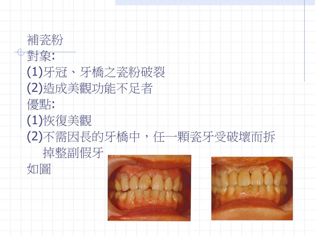 補瓷粉 對象: (1)牙冠、牙橋之瓷粉破裂 (2)造成美觀功能不足者 優點: (1)恢復美觀 (2)不需因長的牙橋中,任一顆瓷牙受破壞而拆 掉整副假牙 如圖