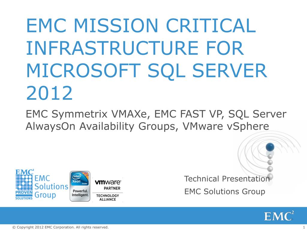 EMC MISSION CRITICAL INFRASTRUCTURE FOR MICROSOFT SQL SERVER 2012 EMC Symmetrix VMAXe, EMC FAST VP, SQL Server AlwaysOn Availability Groups, VMware vSphere Technical Presentation EMC Solutions Group