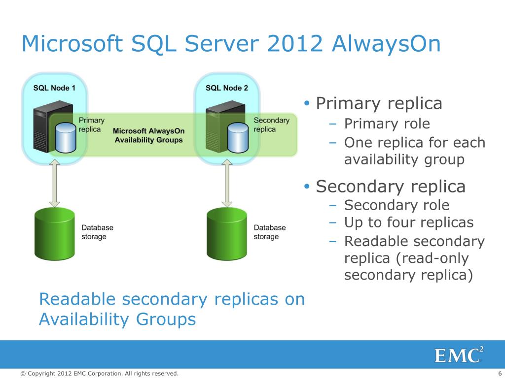 Microsoft SQL Server 2012 AlwaysOn • Primary replica • Primary role • One replica for each availability group • Secondary replica • Secondary role • Up to four replicas • Readable secondary replica (read-only secondary replica) • Readable secondary replicas on Availability Groups
