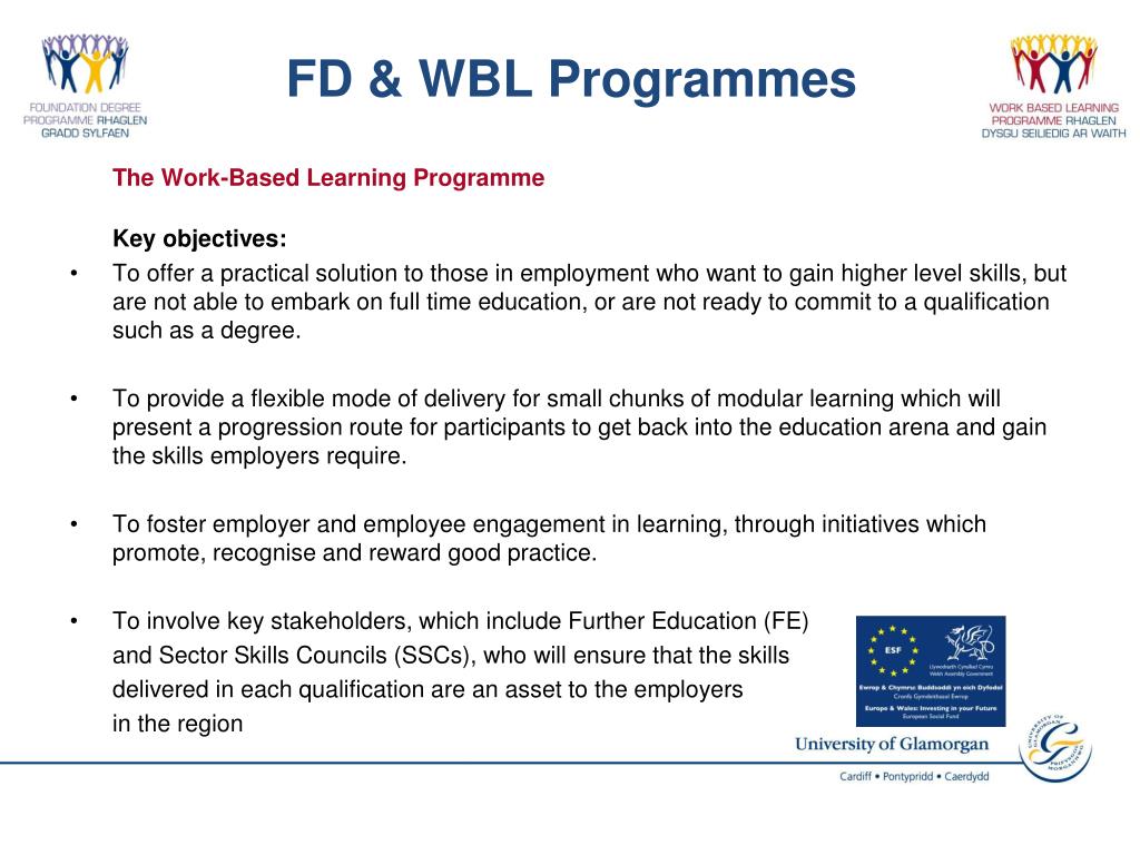 FD & WBL Programmes The Foundation Degree (FD) and Work Based Learning (WBL) Programmes are led by the University of Glamorgan on behalf of the HE sector in Wales. The programmes are supported by the European Social Fund (ESF) • FD will develop and deliver Foundation Degrees equivalent to CQFW level 5 for employed participants within the private sector • WBL will develop a range of WBL bite-sized opportunities at CQFW level 4 and above for learners currently in private sector employment The Programmes will operate in collaboration with business and other appropriate stakeholders which include Further Education and the Sector Skills Councils (SSCs)