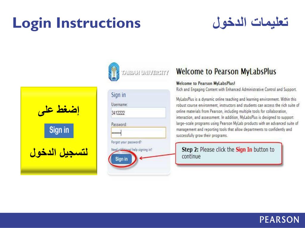 To MyLabsPlus. How To Access Your eText Courses & How To Retrieve Your Forgotten Password? Guide. الخطوة الأولى: يرجى إدخال إسم المستخدم والكلمة السرية (إستخدم رقمك الطالبي في الحقلين المشار لهما). Login Instructions. تعليمات الدخول. Go to ( إذهب إلى ) www.taibahu.mylabsplus.com.