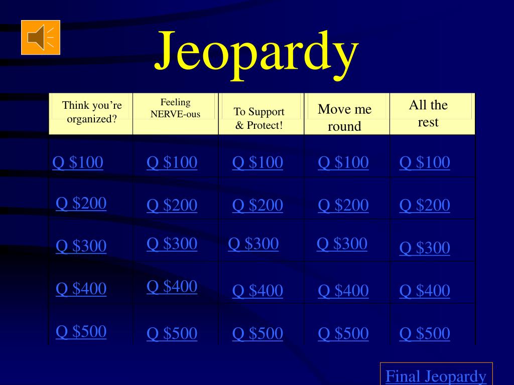 Jeopardy Feeling NERVE-ous All the rest Think you’re organized? Move me round To Support & Protect! Q $100 Q $100 Q $100 Q $100 Q $100 Q $200 Q $200 Q $200 Q $200 Q $200 Q $300 Q $300 Q $300 Q $300 Q $300 Q $400 Q $400 Q $400 Q $400 Q $400 Q $500 Q $500 Q $500 Q $500 Q $500 Final Jeopardy