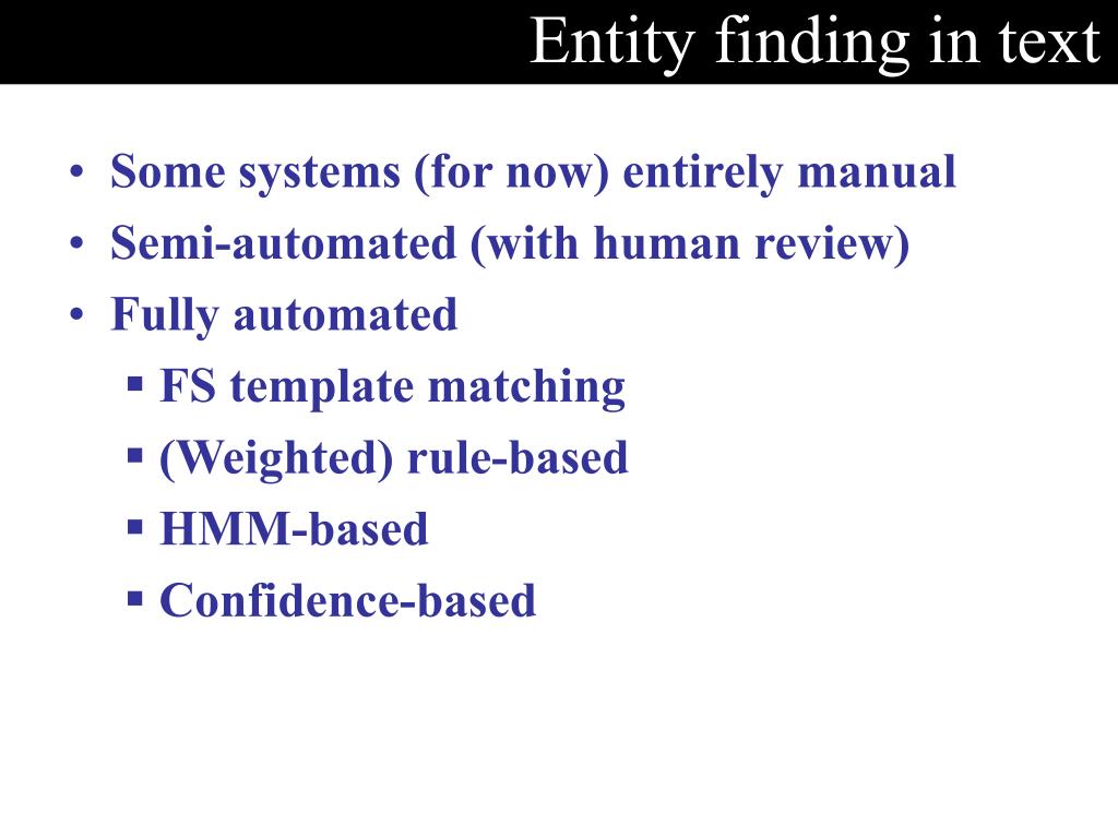 Entity finding in text • Some systems (for now) entirely manual • Semi-automated (with human review) • Fully automated • FS template matching • (Weighted) rule-based • HMM-based • Confidence-based