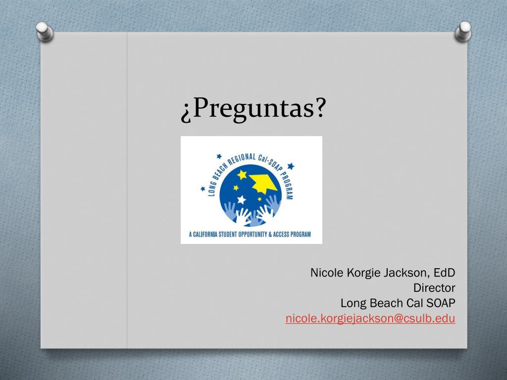 ¿Preguntas? Nicole Korgie Jackson, EdD Director Long Beach Cal SOAP nicole.korgiejackson@csulb.edu