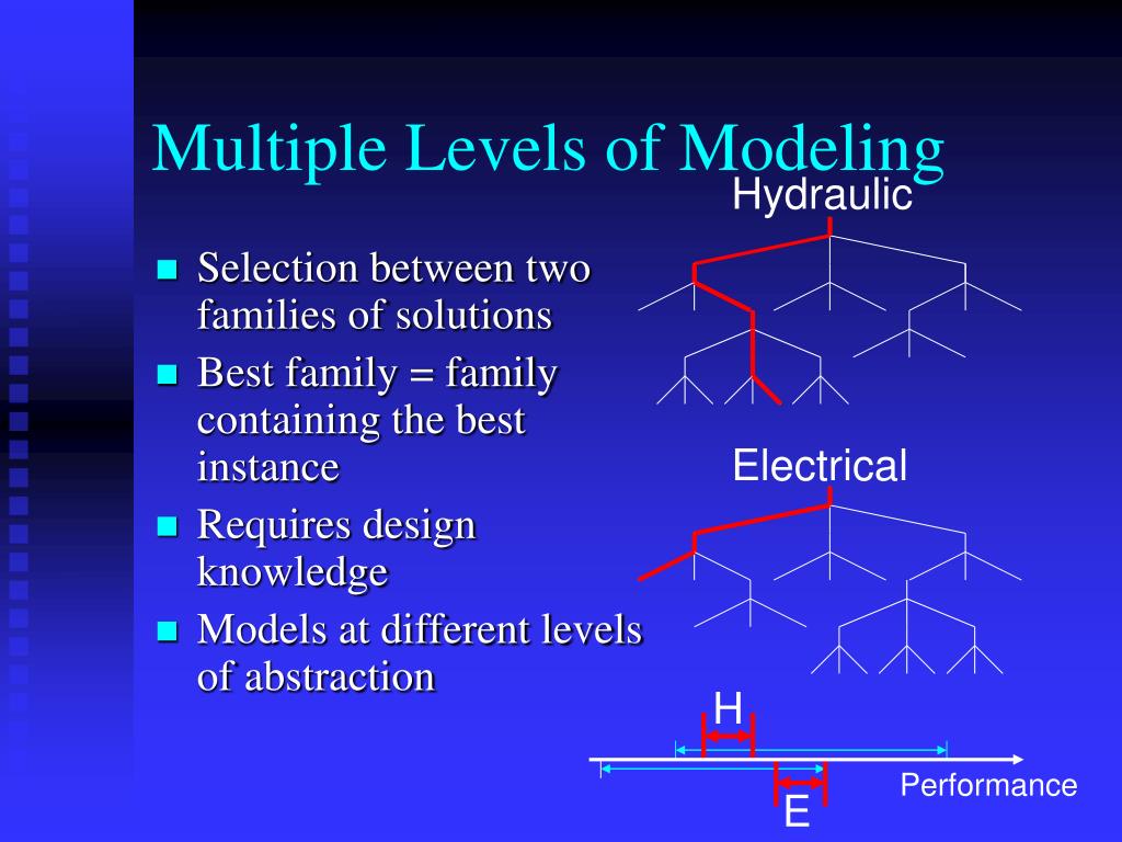 Multiple Levels of Modeling Hydraulic • Selection between two families of solutions • Best family = family containing the best instance • Requires design knowledge • Models at different levels of abstraction Electrical H Performance E