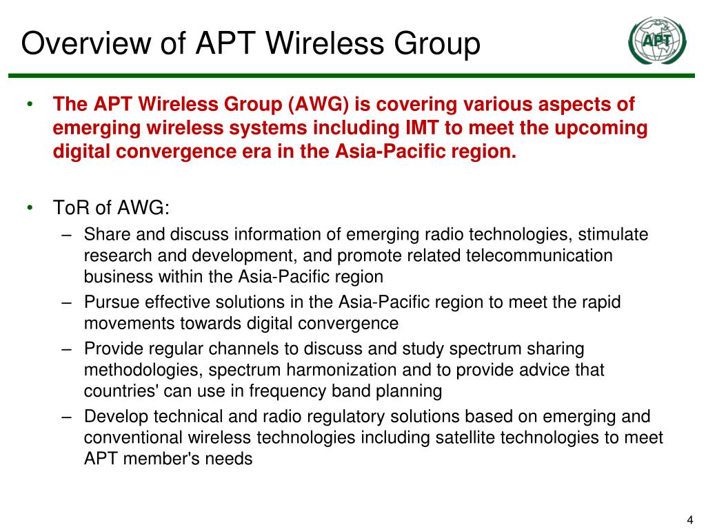 Overview of APT Wireless Group • The APT Wireless Group (AWG) is covering various aspects of emerging wireless systems including IMT to meet the upcoming digital convergence era in the Asia-Pacific region. • ToR of AWG: • Share and discuss information of emerging radio technologies, stimulate research and development, and promote related telecommunication business within the Asia-Pacific region • Pursue effective solutions in the Asia-Pacific region to meet the rapid movements towards digital convergence • Provide regular channels to discuss and study spectrum sharing methodologies, spectrum harmonization and to provide advice that countries' can use in frequency band planning • Develop technical and radio regulatory solutions based on emerging and conventional wireless technologies including satellite technologies to meet APT member's needs