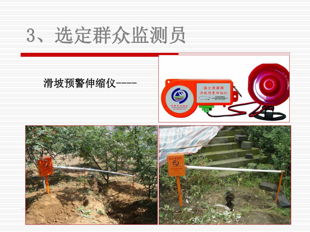 3、选定群众监测员 裂缝报警器--- 对滑坡崩塌体上建筑物裂缝进行小量程位移监测。 简易监测 报警装置