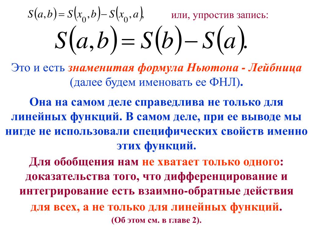 или, упростив запись: Это и есть знаменитая формула Ньютона - Лейбница(далее будем именовать ее ФНЛ). Она на самом деле справедлива не только для линейных функций. В самом деле, при ее выводе мы нигде не использовали специфических свойств именно этих функций. Для обобщения нам не хватает только одного: доказательства того, что дифференцирование и интегрирование есть взаимно-обратные действия для всех, а не только для линейных функций. (Об этом см. в главе 2).