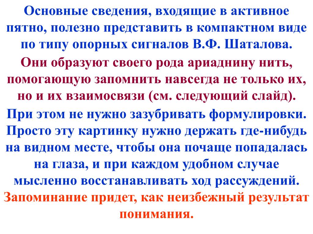 Основные сведения, входящие в активное пятно, полезно представить в компактном виде по типу опорных сигналов В.Ф. Шаталова. Они образуют своего рода ариаднину нить, помогающую запомнить навсегда не только их, но и их взаимосвязи (см. следующий слайд). При этом не нужно зазубривать формулировки. Просто эту картинку нужно держать где-нибудь на видном месте, чтобы она почаще попадалась на глаза, и при каждом удобном случае мысленно восстанавливать ход рассуждений. Запоминание придет, как неизбежный результат понимания.