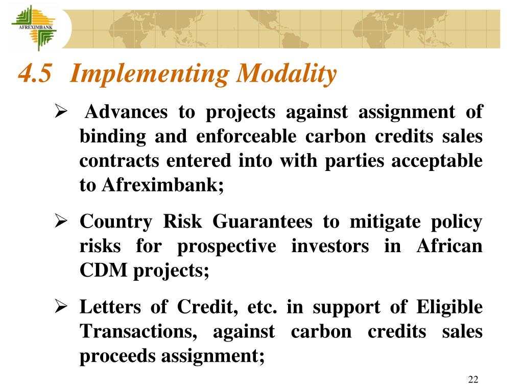 4.5 Implementing Modality • Advances to projects against assignment of binding and enforceable carbon credits sales contracts entered into with parties acceptable to Afreximbank; • Country Risk Guarantees to mitigate policy risks for prospective investors in African CDM projects; • Letters of Credit, etc. in support of Eligible Transactions, against carbon credits sales proceeds assignment;