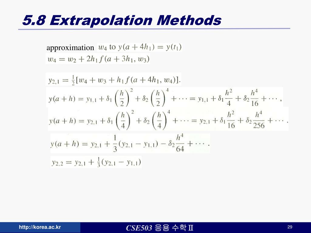 5.8 Extrapolation Methods assume fixed step size h, y(ti)=y(a+h) let h0 = h/2, use Euler's method with ω0=a , y(a + h0) = y(a+h/2) apply Midpoint method let h = h/4 use Euler's method ω0=a , y(a + h1) = y(a+h/4) with ω1, y(a + 2h1) = y(a+h/2) with ω2 , y(a + 3h1) = y(a+3h/4) with ω3