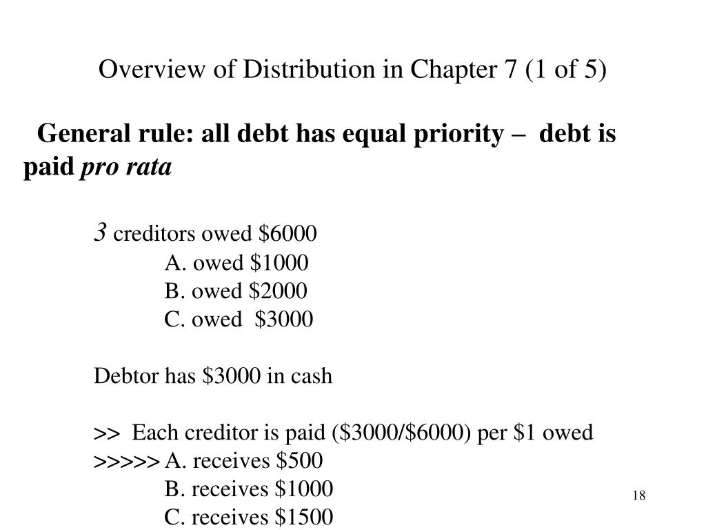 Overview of Distribution in Chapter 7 (1 of 5) General rule: all debt has equal priority – debt is paid pro rata 3 creditors owed $6000 A. owed $1000 B. owed $2000 C. owed $3000 Debtor has $3000 in cash >> Each creditor is paid ($3000/$6000) per $1 owed >>>>> A. receives $500 B. receives $1000 C. receives $1500