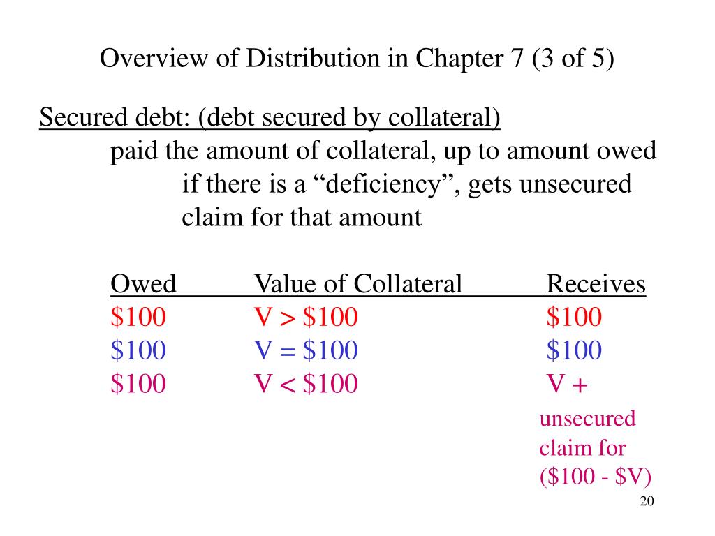 Overview of Distribution in Chapter 7 (3 of 5) Secured debt: (debt secured by collateral) paid the amount of collateral, up to amount owed if there is a “deficiency”, gets unsecured claim for that amount Owed Value of Collateral Receives $100 V > $100 $100 $100 V = $100 $100 $100 V < $100 V + unsecured claim for ($100 - $V)