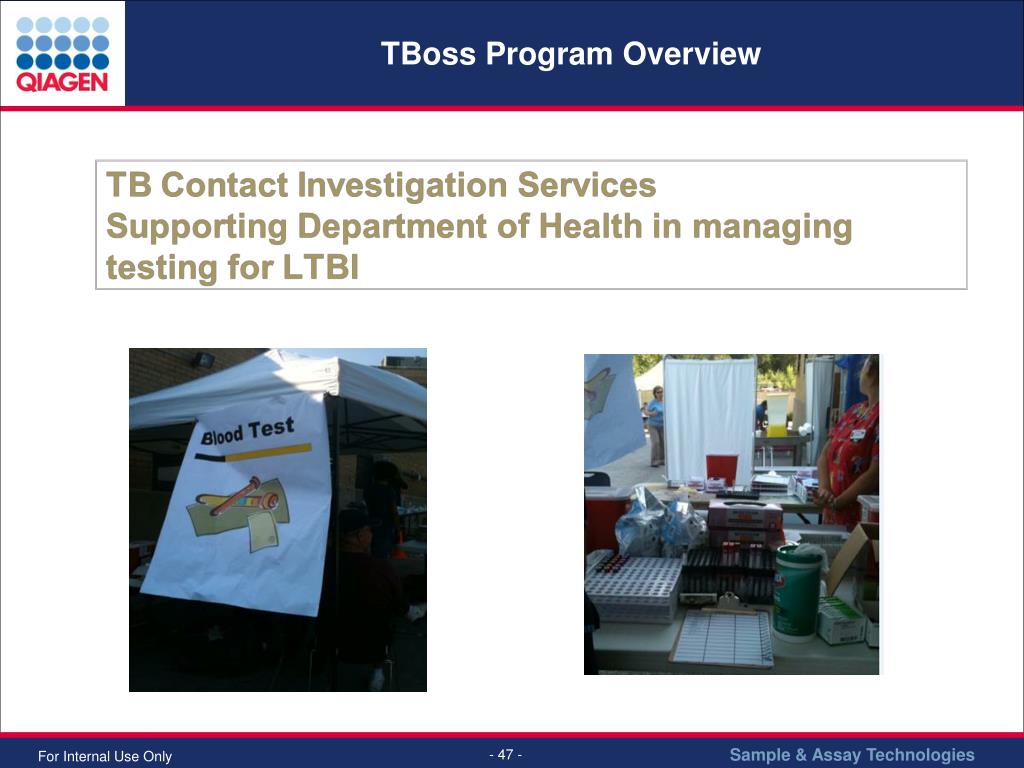 Role of Cellestis • Have Program Coordinator on site who works closely with DOH • Work through checklist to mobilize resources needed • Ensure • QFT kits are available on site • Blood draw logistics in place including trained phlebotomists, blood collection kit (butterflies etc…) • Identify preferred laboratory for QFT testing • Coordinate collection, tube handling and shipment to testing laboratory • Be a liaison with lab and DOH to ensure data integration
