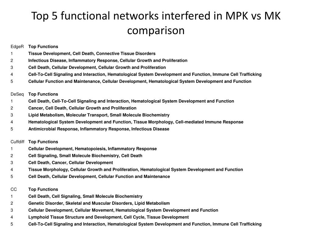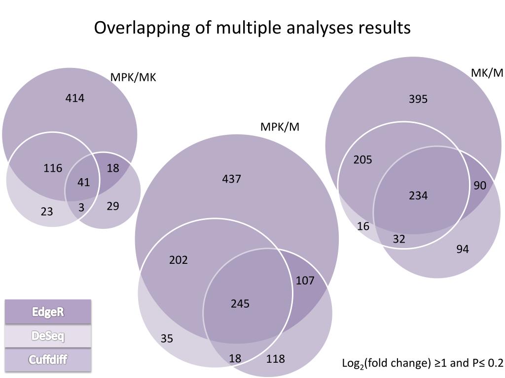 Overlapping of multiple analyses results MK/M MPK/MK 414 395 MPK/M 437 116 18 41 205 29 3 90 23 234 202 16 32 107 94 245 EdgeR 35 DeSeq 18 118 Cuffdiff Log2(fold change) ≥1 and P≤ 0.2