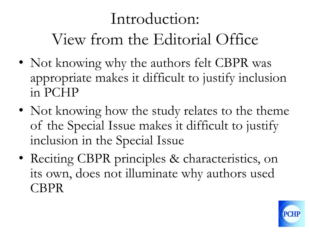 Introduction: View from the Editorial Office • Not knowing why the authors felt CBPR was appropriate makes it difficult to justify inclusion in PCHP • Not knowing how the study relates to the theme of the Special Issue makes it difficult to justify inclusion in the Special Issue • Reciting CBPR principles & characteristics, on its own, does not illuminate why authors used CBPR