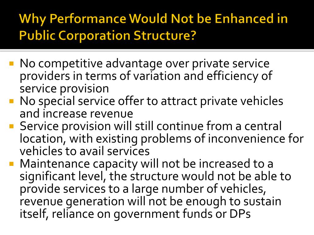 Why Performance Would Not be Enhanced in Public Corporation Structure? • No competitive advantage over private service providers in terms of variation and efficiency of service provision • No special service offer to attract private vehicles and increase revenue • Service provision will still continue from a central location, with existing problems of inconvenience for vehicles to avail services • Maintenance capacity will not be increased to a significant level, the structure would not be able to provide services to a large number of vehicles, revenue generation will not be enough to sustain itself, reliance on government funds or DPs