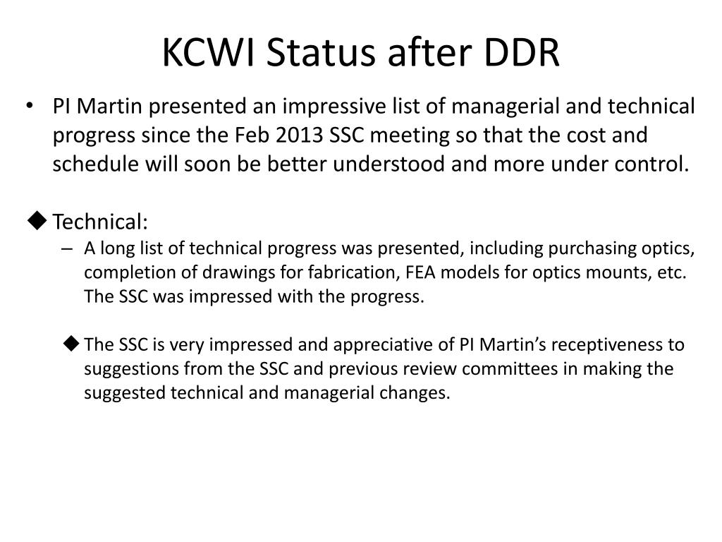 KCWI Status after DDR • PI Martin presented an impressive list of managerial and technical progress since the Feb 2013 SSC meeting so that the cost and schedule will soon be better understood and more under control. • Technical: • A long list of technical progress was presented, including purchasing optics, completion of drawings for fabrication, FEA models for optics mounts, etc. The SSC was impressed with the progress. • The SSC is very impressed and appreciative of PI Martin’s receptiveness to suggestions from the SSC and previous review committees in making the suggested technical and managerial changes.