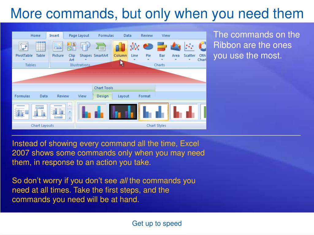 More commands, but only when you need them The commands on the Ribbon are the ones you use the most. Instead of showing every command all the time, Excel 2007 shows some commands only when you may need them, in response to an action you take. So don’t worry if you don’t see all the commands you need at all times. Take the first steps, and the commands you need will be at hand. Get up to speed