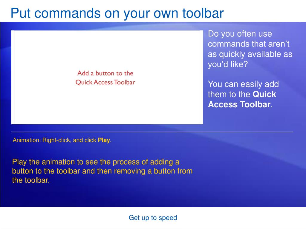 Put commands on your own toolbar Do you often use commands that aren’t as quickly available as you’d like? You can easily add them to the Quick Access Toolbar. Animation: Right-click, and click Play. Play the animation to see the process of adding a button to the toolbar and then removing a button from the toolbar. Get up to speed