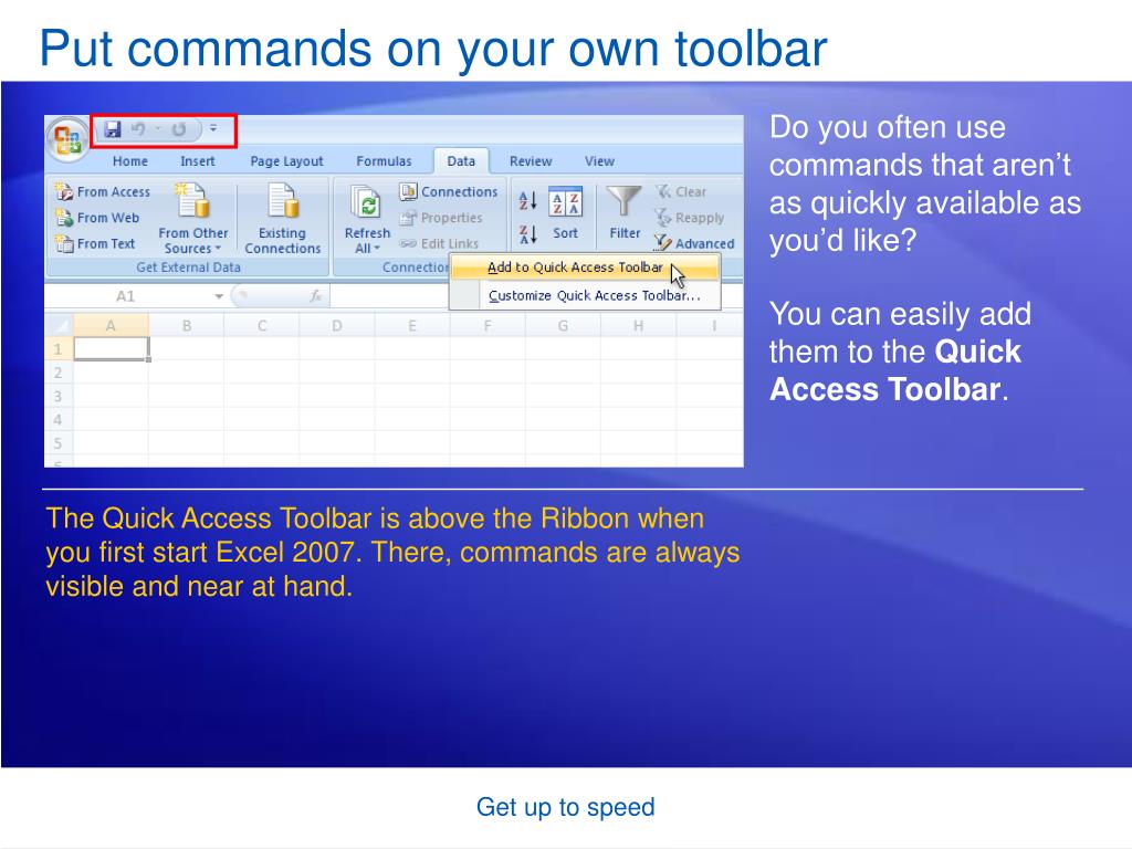 Put commands on your own toolbar Do you often use commands that aren’t as quickly available as you’d like? You can easily add them to the Quick Access Toolbar. The Quick Access Toolbar is above the Ribbon when you first start Excel 2007. There, commands are always visible and near at hand. Get up to speed