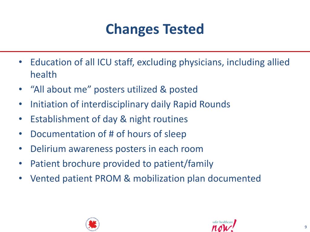 Changes Tested • Education of all ICU staff, excluding physicians, including allied health • “All about me” posters utilized & posted • Initiation of interdisciplinary daily Rapid Rounds • Establishment of day & night routines • Documentation of # of hours of sleep • Delirium awareness posters in each room • Patient brochure provided to patient/family • Vented patient PROM & mobilization plan documented