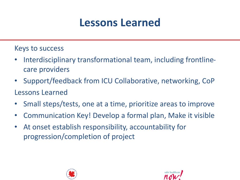 Lessons Learned Keys to success Interdisciplinary transformational team, including frontline-care providers Support/feedback from ICU Collaborative, networking, CoP Lessons Learned Small steps/tests, one at a time, prioritize areas to improve Communication Key! Develop a formal plan, Make it visible At onset establish responsibility, accountability for progression/completion of project